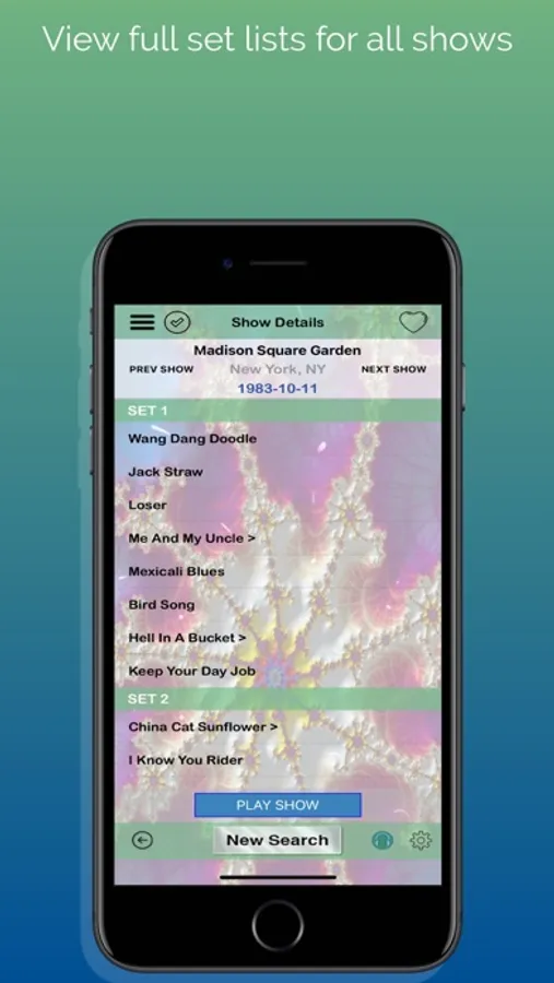 DEADSHOWZ is an incredibly powerful searchable standalone mobile digital database of Grateful Dead concerts, and allows Grateful Dead fans to search every single Grateful Dead concert by multiple criteria. DEADSHOWZ instantly returns a list of shows with set lists matching those criteria, and fans can explore Furthur by digging even deeper via additional search criteria (including the ability to use AND/OR/NOT qualifiers in ALL searches!).