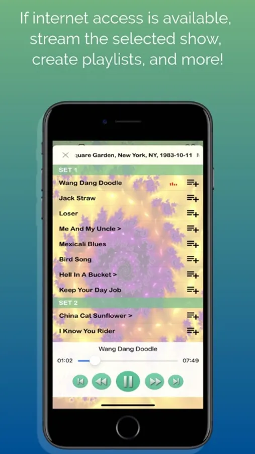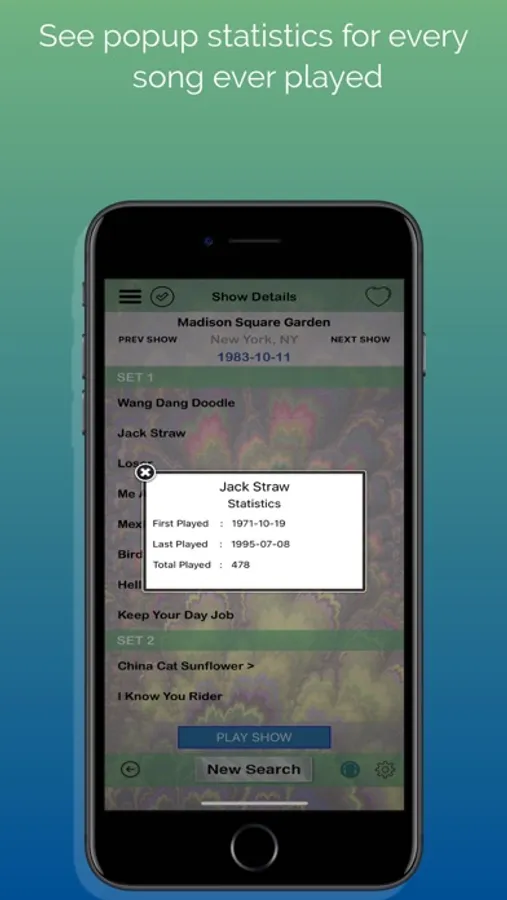 Fans can create custom playlists, indicate which shows they've actually attended, tag shows as Favorites, and get statistics (First Played, Last Played, Total Played) for every Song, Venue, City, State, Country and Guest Artist in the list from a single tap on the screen (see screen shot for “Jack Straw” stats popup example). And as long as both a recording exists for a selected show and the app has Internet access, DEADSHOWZ will start streaming the chosen show with a single click!