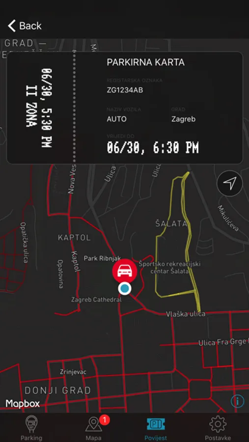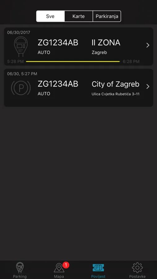 • povijest karata kupljenih pomoću aplikacije i mjesta na kojima je bio označn parking vozila