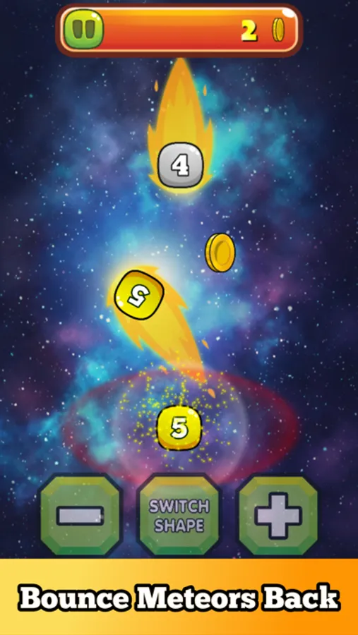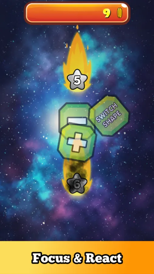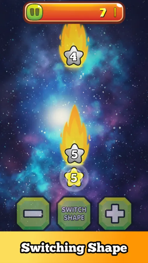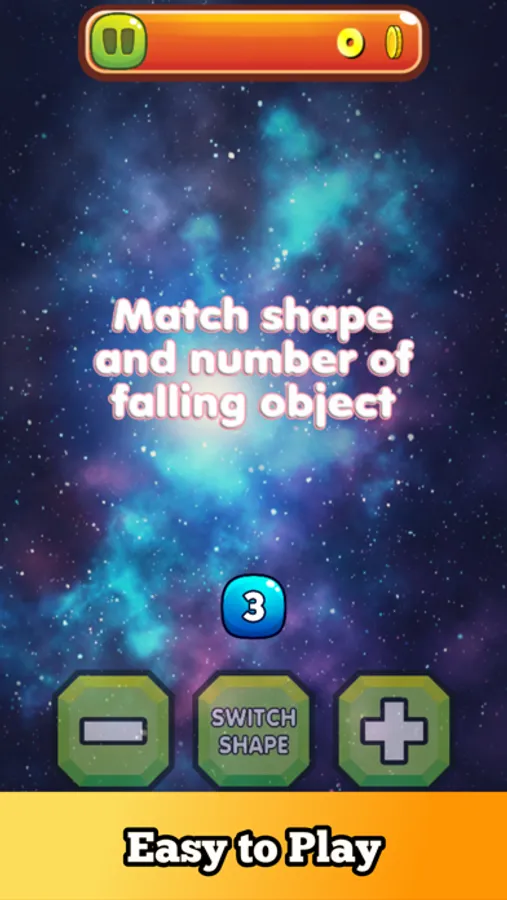 Number Shift is an addictive game to train your concentration and reaction. Focus and think fast to change the number and shape of player to match the falling object. Tap + or - buttons to increase or decrease current numerical value of player. Tap the "Switch Shape" button to toggle between star and round square. If both number and shape of player match the falling object's, player will bounce and destroy it and you will get a score point. If you aren't fast enough to change, the game is over.