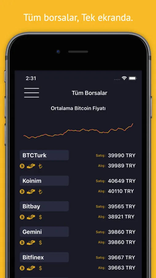 Kripto para birimleri için tüm borsa fiyatlarını tek ekranda görün. Arasındaki fiyat farklarını anında hesaplayın ve kâr zarar hesaplamasını tek dokunuşla bütçenize özel yapın.