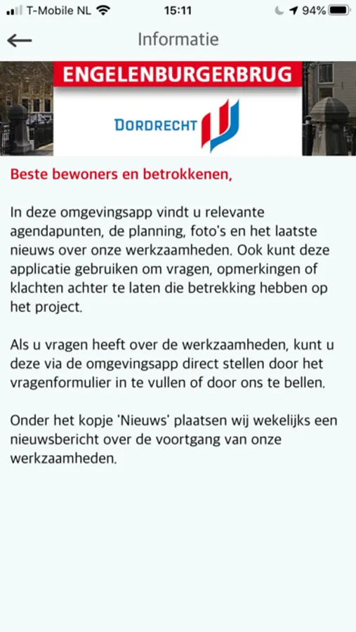 In deze app vindt u alle informatie over de werkzaamheden van het project Engelenburgerbrug. Er worden relevante agenda puntjes, de laatste planning en contactinformatie weergegeven . Ook kunt u op deze app vragen, opmerkingen of klachten achterlaten die betrekking hebben op het project.