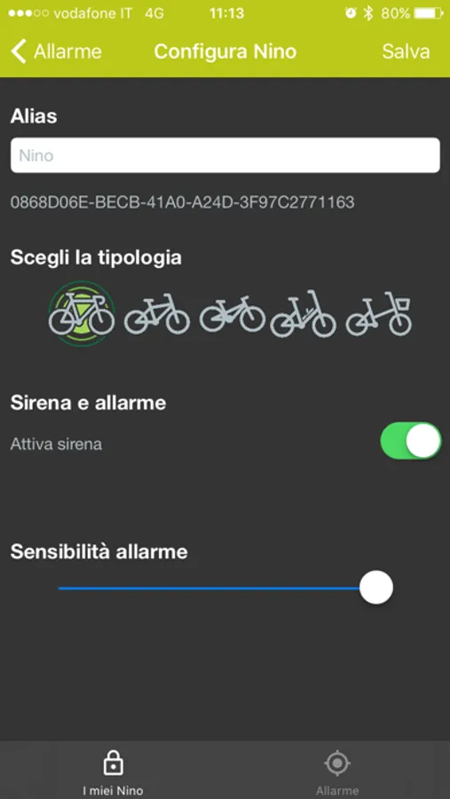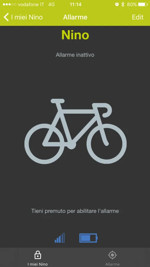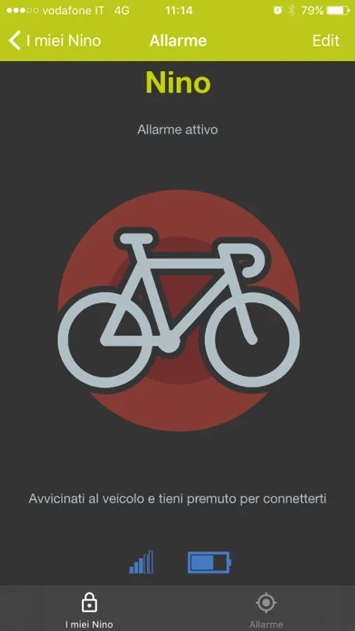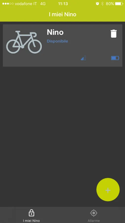 Dopo aver parcheggiato e aver messo in sicurezza la vostra biciletta con un comune lucchetto, basterà aprire la APP che si connetterà automaticamente al vostro NINO. Cliccando sull’icona della bici si potrà attivare o disattivare la protezione. In caso di tentato furto o manomissione, NINO inizierà a suonare e a trasmettere un segnale radio Bluetooth al vostro smartphone che suonando e vibrando, vi avviserà del tentativo di furto. Se abilitata la funzione PONTE, NINO invierà anche un SMS al numero configurato nelle impostazioni. L’utente potrà in ogni momento zittire l’allarme e, avvicinandosi al veicolo, disattivare la protezione. Se i sensori di NINO rileveranno solo una vibrazione o un piccolo urto, l’allarme sullo smartphone si silenzierà automaticamente dopo alcuni secondi (se abilitata la funzione di auto spegnimento).