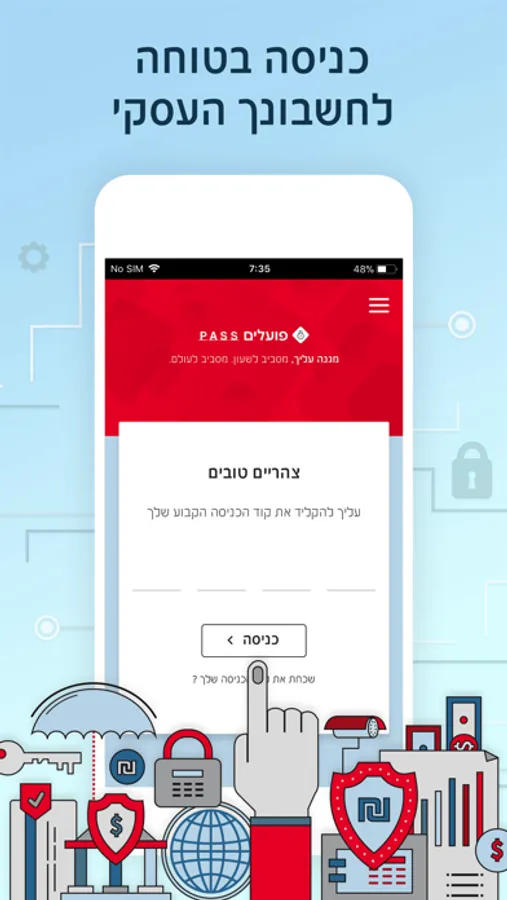 אפליקציית פועלים Pass מפיקה קוד הזדהות חד פעמי ומאפשרת לך להיכנס לחשבון העסקי בבנק הפועלים ולפעול בו בנוחות ובבטחה. קוד זה הוא שכבת הגנה נוספת לחשבון ובאמצעותו ניתן לאמת את זהותך בקלות ובמהירות.
