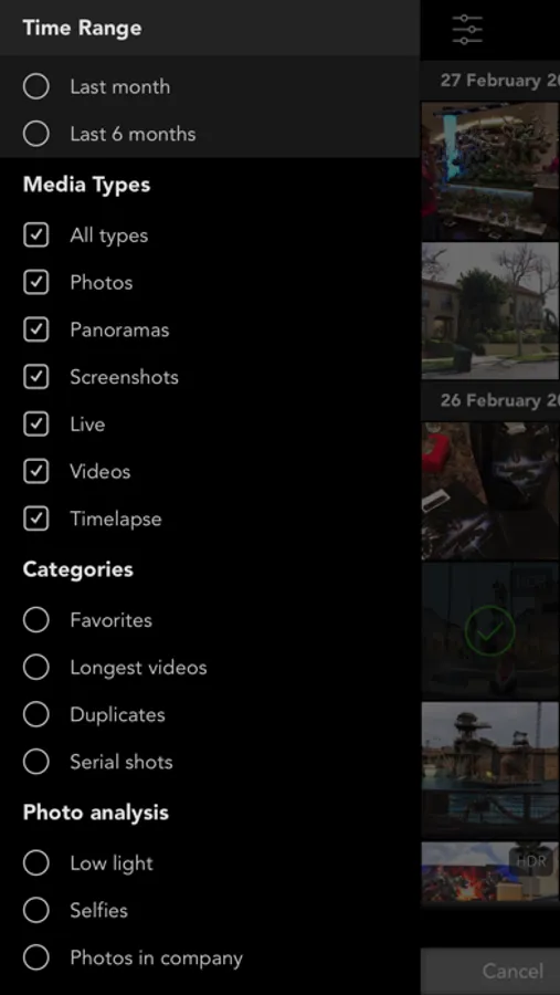 - Sort photos by their type and date of creation