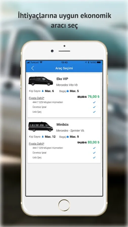 - Farklı araç tipleri ve fiyatları üzerinden kolayca seçiminizi yapın. Araçlar yalnızca size özel rezerve edilmiş olup, toplam araç fiyatları gösterilmektedir.