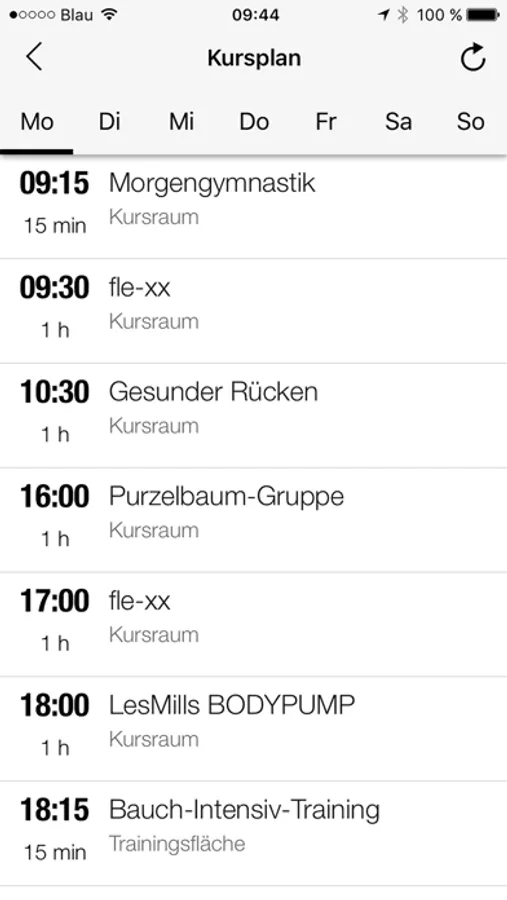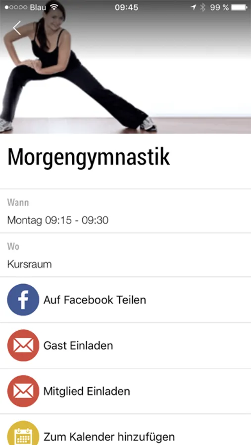 Direkter und aktueller Zugriff auf den Kursplan von überall: Für jeden Kurs kannst Du Details wie Zeit, Kursbeschreibung, Raum und Merkmale wie z.B. den Schwierigkeitsgrad einsehen.