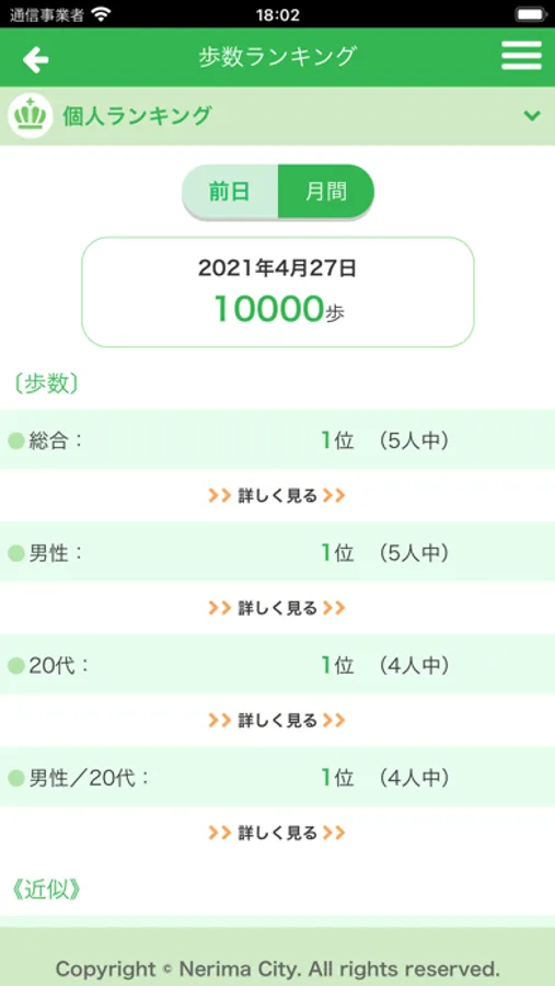 前日の歩数と前月の累計歩数のランキングを表示します。また、プロフィールの設定で性別や生年月を登録すると、性別・年代別ランキングも見ることができます。(ニックネーム登録した場合)
