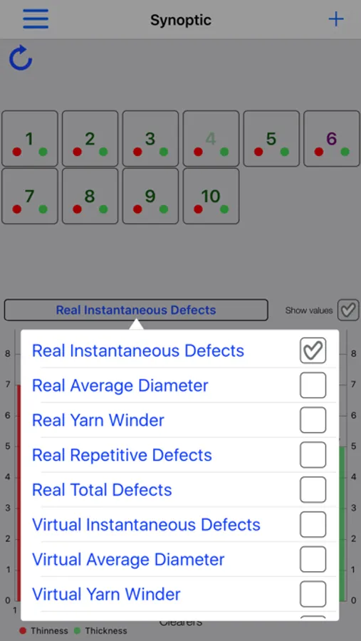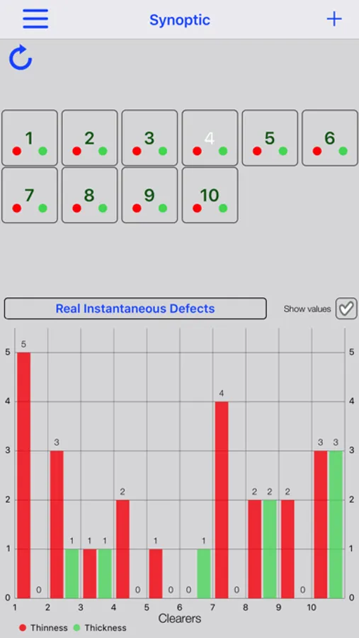NOTE: the demo version emulates clearers that only detect Real Instantaneous Defects (~75% thins, ~25% thick) with random Missed Polls. The charts shown by the app only refer to this. Using the demo version all commands, to change the clearer Parameters and Other Values shown, run smoothly, but no data are affected and most returns are zeroed.