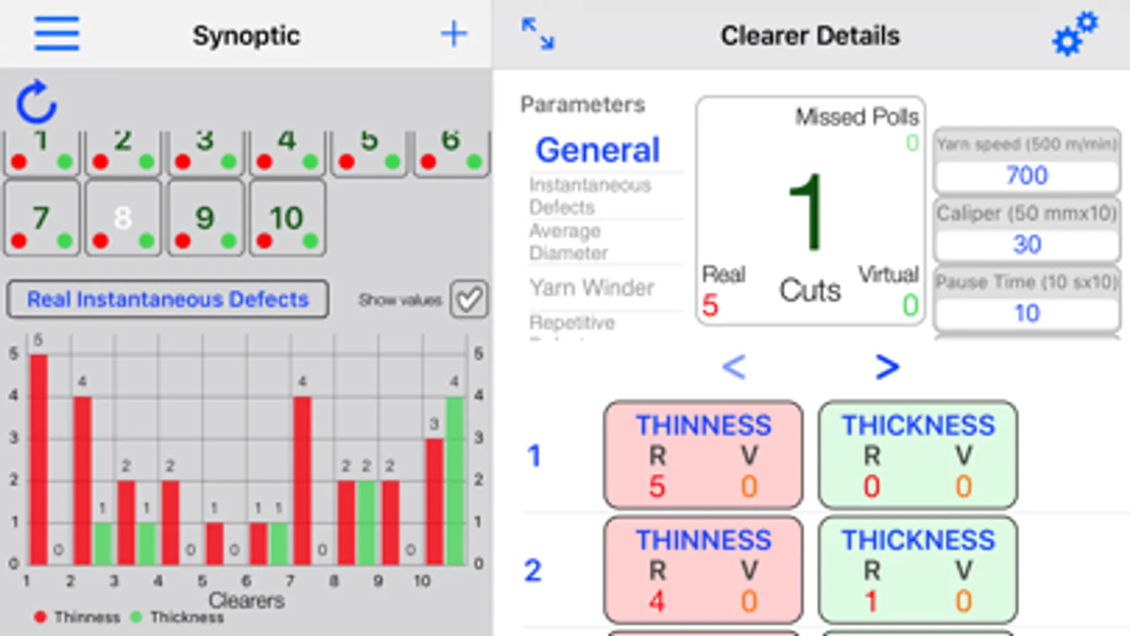 NIC makes each clearer to cut the yarn when detects a yarn single defect according to the 'Real' settings. For each 'Virtual' defect detected instead, according to the Virtual settings, NIC records that defect but does not make cut the yarn.