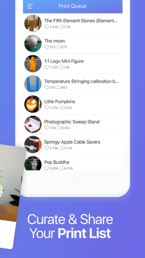 Swipe through over 600K(!!) free, downloadable 3D print models and curate your own print list.