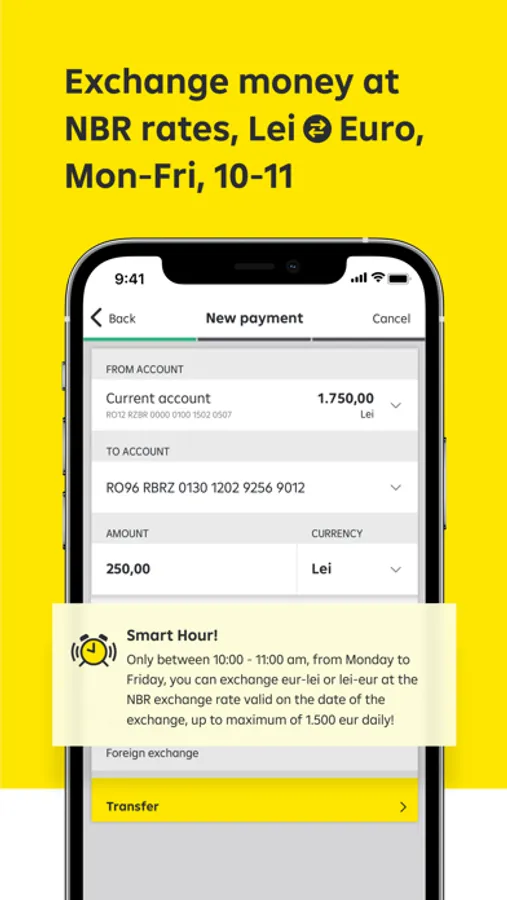 • Smart Hour - BNR exchange rates: Exchange between RON and EUR at the NBR exchange rate from Monday to Friday 10:00 - 11:00.