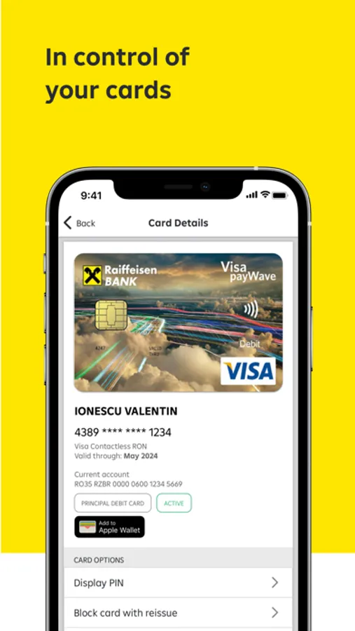 • Control over your cards: Block, reissue, or view your card PIN with just one touch.