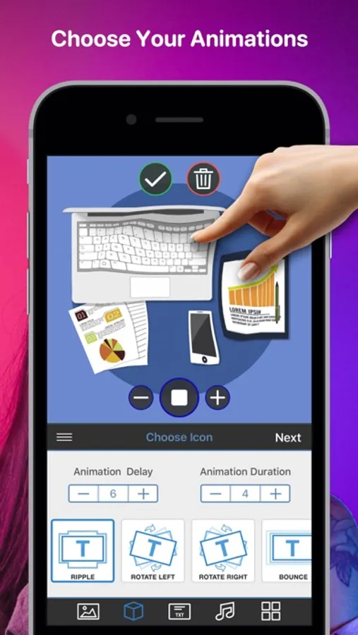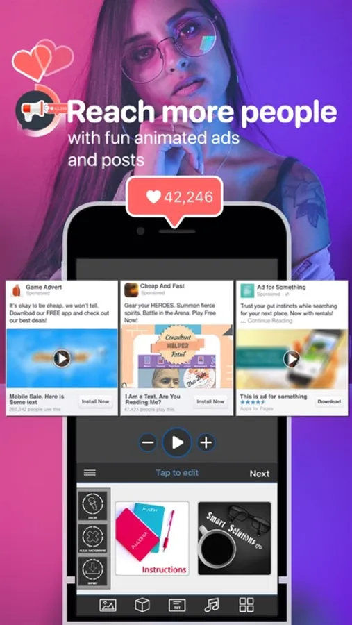 Customize your ads & posts with a variety of eye-catching animations, designs, icons, styles, fonts and music