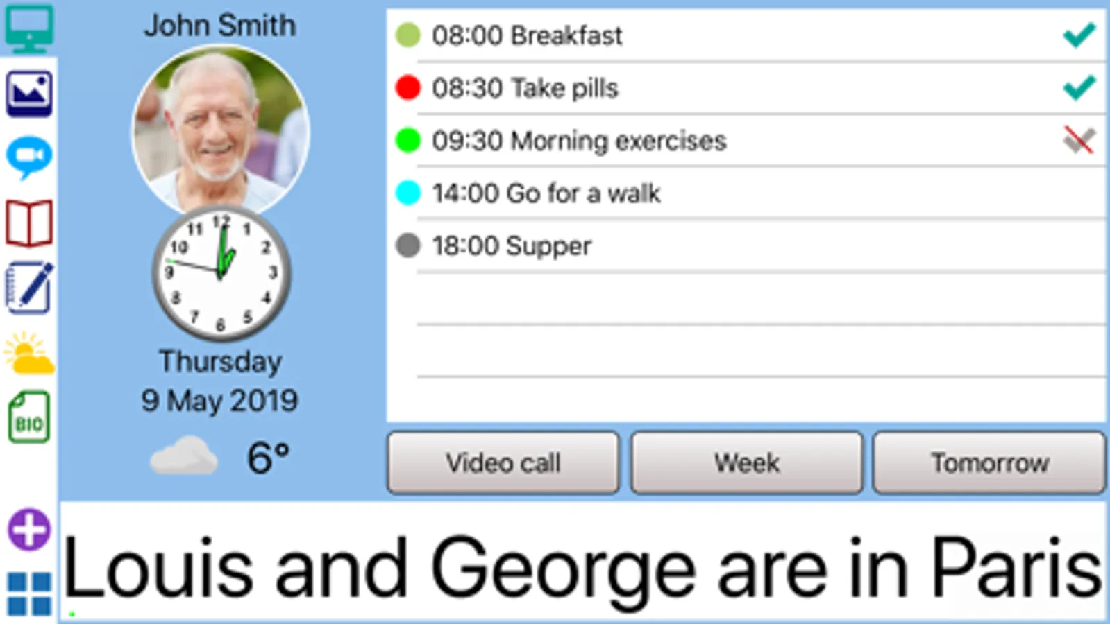 Manage your day more easily, chat to a friend on a video call, view photos from family and friends, let the calendar remind you of that dinner party on Saturday evening and browse through the guestbook.