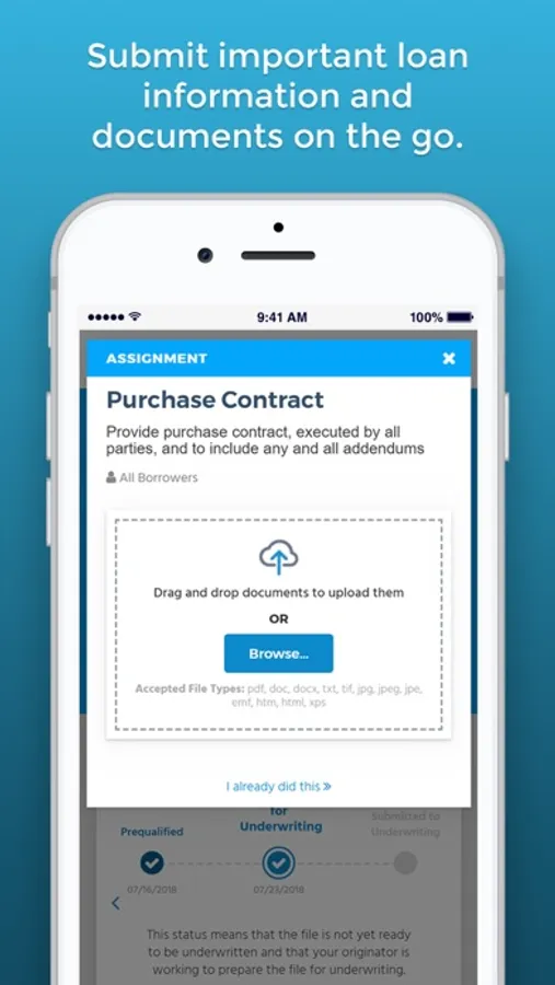 Easily upload documents, get loan updates and notifications of assigned activities with the MyLoanCenter app. Now you can directly access your application directly from your phone making your mortgage loan processing quick and easy.