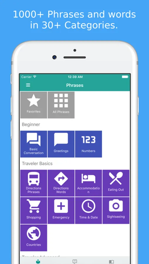 * Advanced Conversation * Health * Border Crossing * Questions * Places * Food * Vegetables * Fruits * Colors * Romance I * Romance II * Post Office * Phone & Internet * Banking * Occupations * Business Talk * Hobbies * Feelings * Body * Animals * Family * Countries