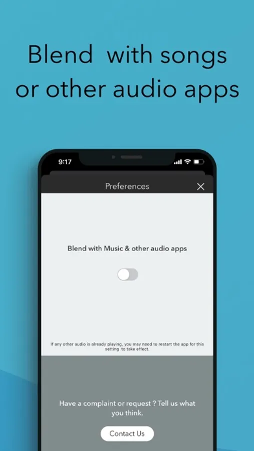 Probably this is the only app in App Store that is loud enough to blend with your music. By default app blends its sounds with other audio apps. You can also turn this feature ON or OFF.