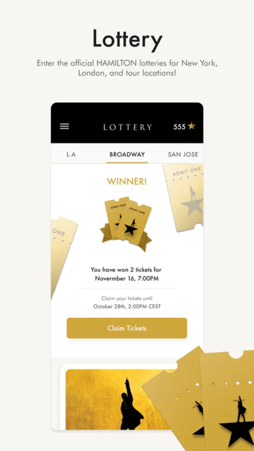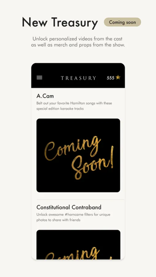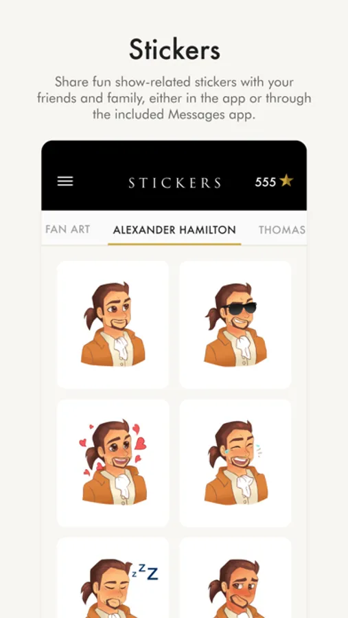 Take and share photos using our exclusive #HamCam with show-themed overlays. Unlock special location-based stickers are theaters and other HAMILTON venues.