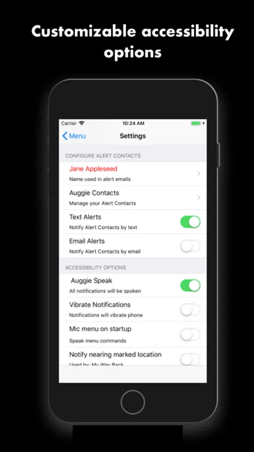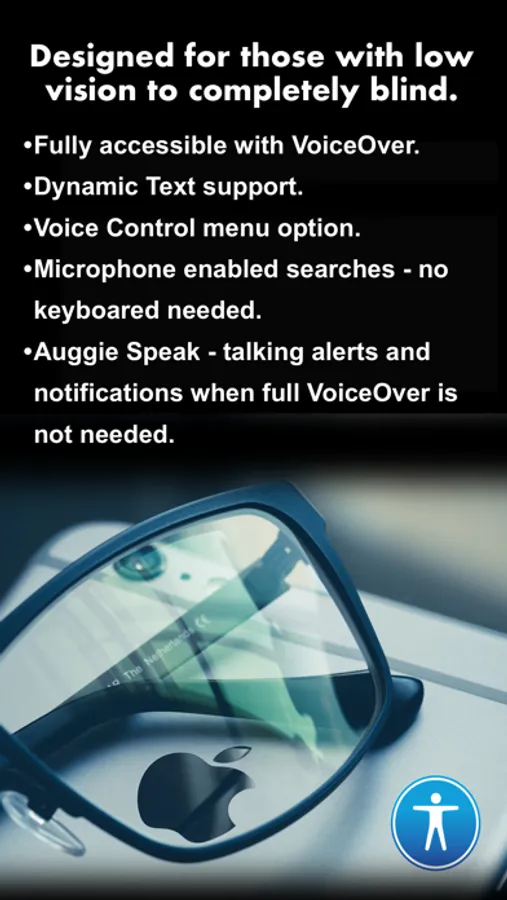 Auggie provides usability that encompasses a range of vision-ability from those with low vision condition to those who are completely blind, which include: