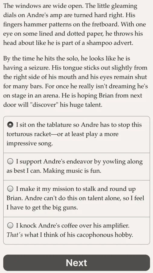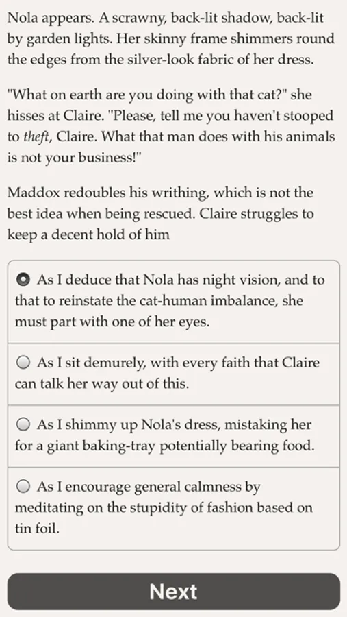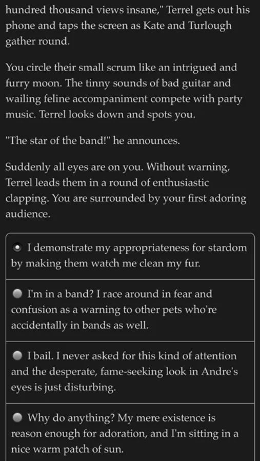 "Choice of the Cat" is a hilarious 600,000-word interactive novel by Jordan Reyne, where your choices control the story. It's entirely text-based, withoupet graphics or sound effects, and fueled by the vast, unstoppable power of your imagination.
