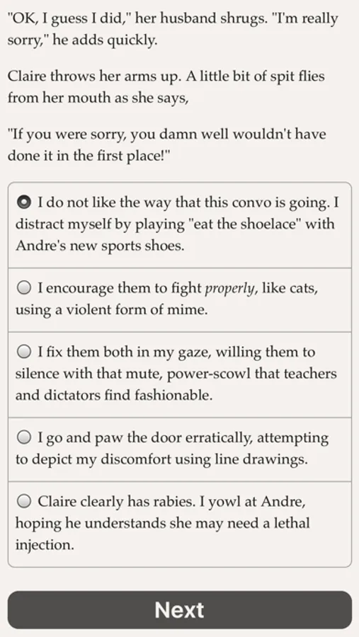 It's the biggest text-based cat simulator ever written; play it many times as different kinds of cat! As a rescue cat, looking for a family to love and obey you forever, you find yourself sharing a home with a family on the brink of divorce. You'll learn to manipulate your owners, their neighbors, and even their other pets to get what you want. (The humans think they're in charge! Aren't they cute?)