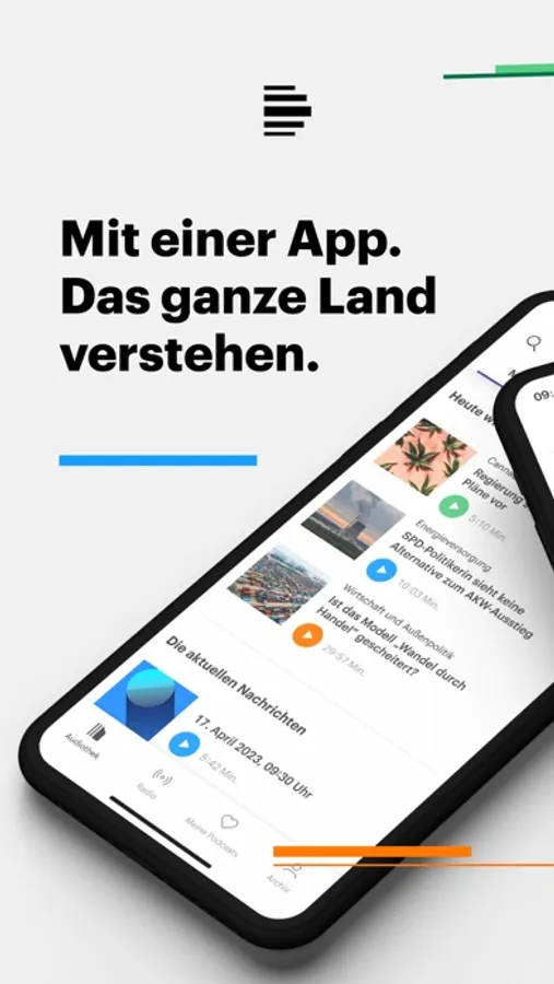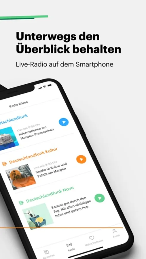 Mit unserer kostenlosen und barrierearmen App erleben Sie alle drei Radio-Programme des Deutschlandfunks: Deutschlandfunk, Dlf Kultur und Dlf Nova. Hören Sie Ihre Lieblingssendung, einen Podcast oder ein Hörspiel, wann und wo Sie wollen - im Livestream oder als Download. Erhalten Sie Nachrichten aus Deutschland und der Welt mit politischen Analysen und Interviews oder hören Sie ein Konzert - wir bieten Ihnen eine vielfältige Auswahl aus den Themenbereichen von Deutschlandfunk, Dlf Nova und Dlf Kultur.