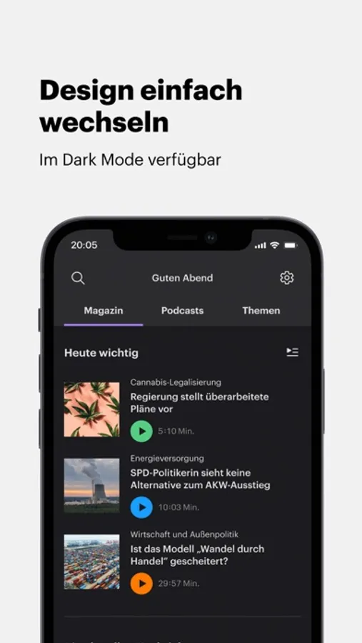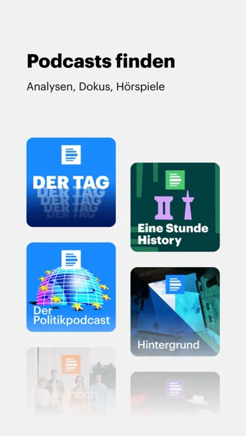 - Themenbereich „Entdecken“: Lassen Sie sich von unseren Redakteuren inspirieren - wir stellen Ihnen einen bunten Mix aus unseren Programmen Deutschlandfunk, Dlf Kultur und Dlf Nova zusammen: News und Debatten zu aktuellen Themen aus Politik, Gesellschaft und Wirtschaft inkl. Analysen und Interviews. Darüber hinaus haben wir für Sie Geschichts- und Wissenschafts-Beiträge, Achtsamkeits-Podcasts sowie eine Übersicht der beliebtesten Podcasts und Hörspiele - übersichtlich dargestellt mit Kurzinformationen zu den Beiträgen inkl. Zeitangaben