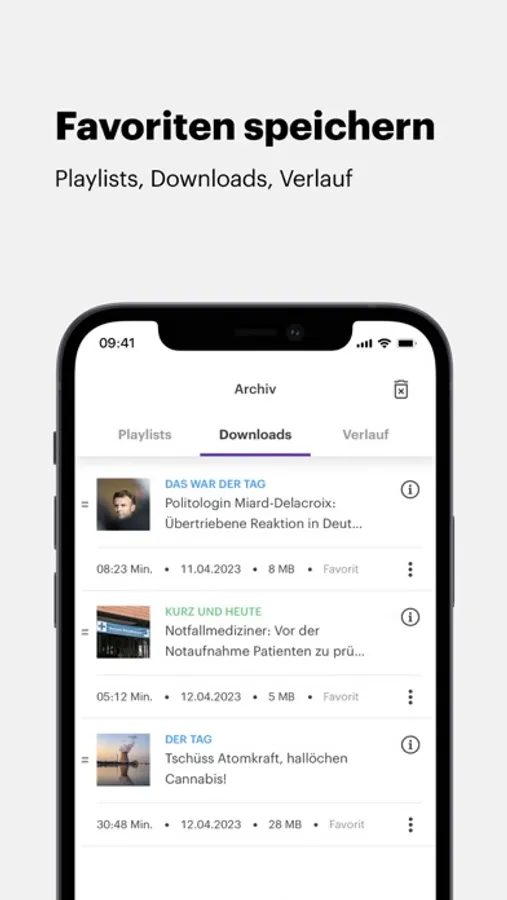 - Archiv-Funktion: Downloads, Playlisten und Weiterleiten. Erstellen Sie Ihre eigenen Playlists unter „mein Archiv“ mit Downloadoption; damit sind Ihre Beiträge jederzeit abrufbar. Dafür wählen Sie direkt in Ihrem Lieblings-Podcast die gewünschte Option aus. Sie finden den Podcast oder das Hörspiel so toll, dass Sie dieses teilen möchten? Auch das können Sie hier direkt - via Social Media, WhatsApp, SMS oder E-Mail
