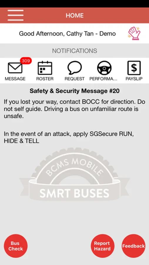 Bus Captain Management System (BCMS) allows bus captain to view driving performance data, view payslip, view and request leave, receive messages and submit hazard report.