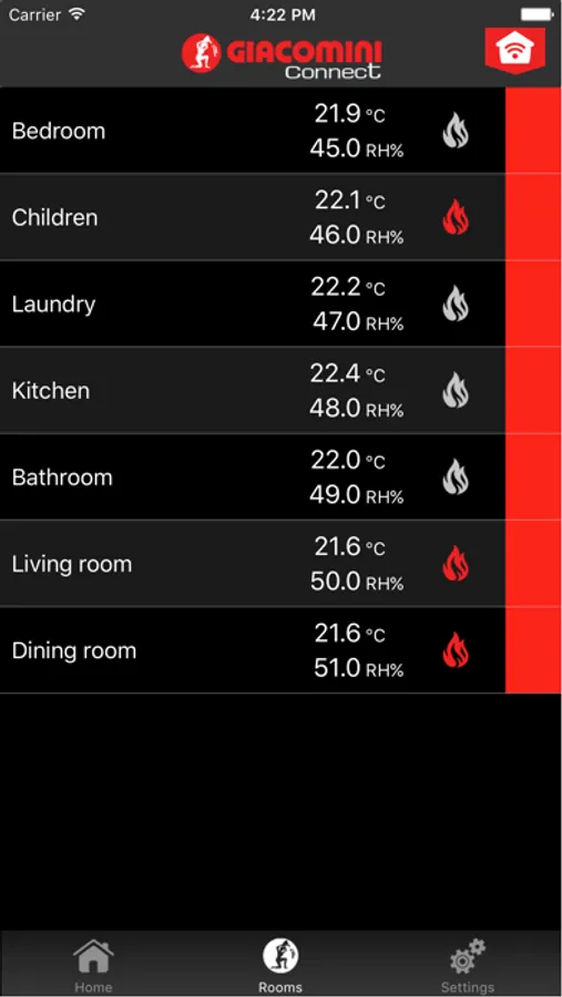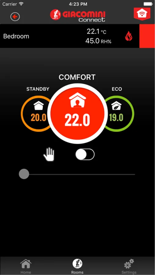 Manage thermoregulation individually in each room, by monitoring current temperature and operational status of the system according to the selected set point. Modify set points by choosing among three standard profiles (comfort, stand-by and economy) or set manually the desired temperature. Set or disable the 'vacation' status for the entire system.