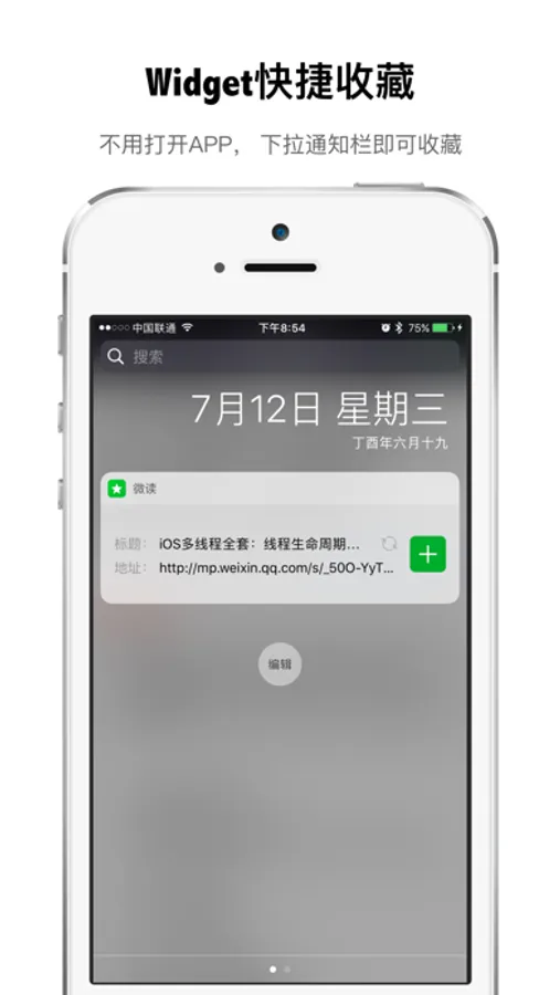 快捷收藏微信公众号、订阅号文章,不需要打开APP,直接下拉通知栏,点击添加按钮即可收藏。