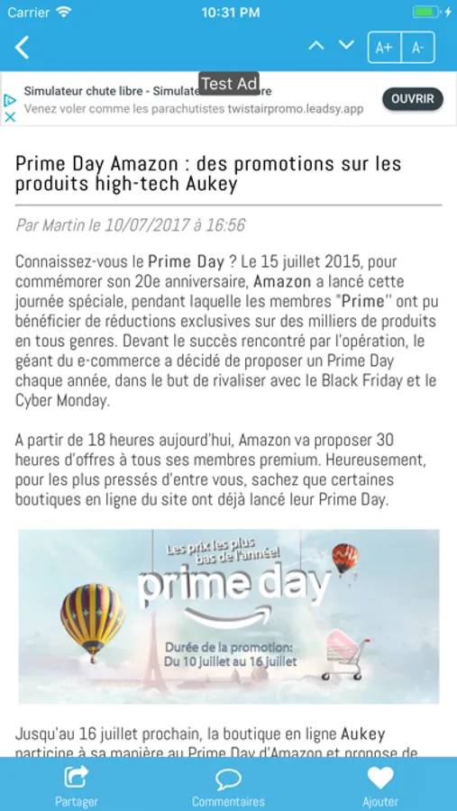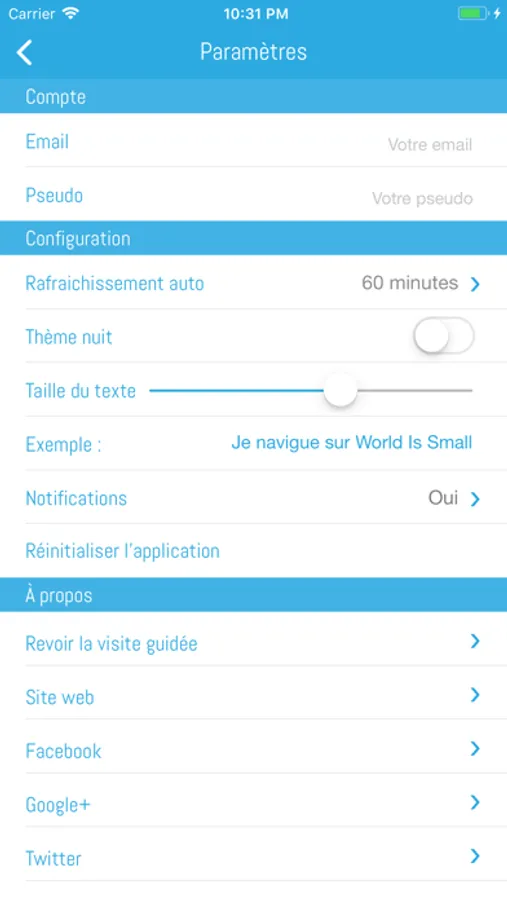 - Un partage des articles par Message, Email, Twitter, Facebook ou encore WhatsApp