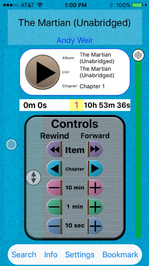 • Precision Time Control: One can pan quickly over the entire book or use a fine panning control. One can jump forward or backward in increments of 10 minutes, 1 minute, or 10 seconds. The current position and time remaining are displayed in hours, minutes, and seconds.