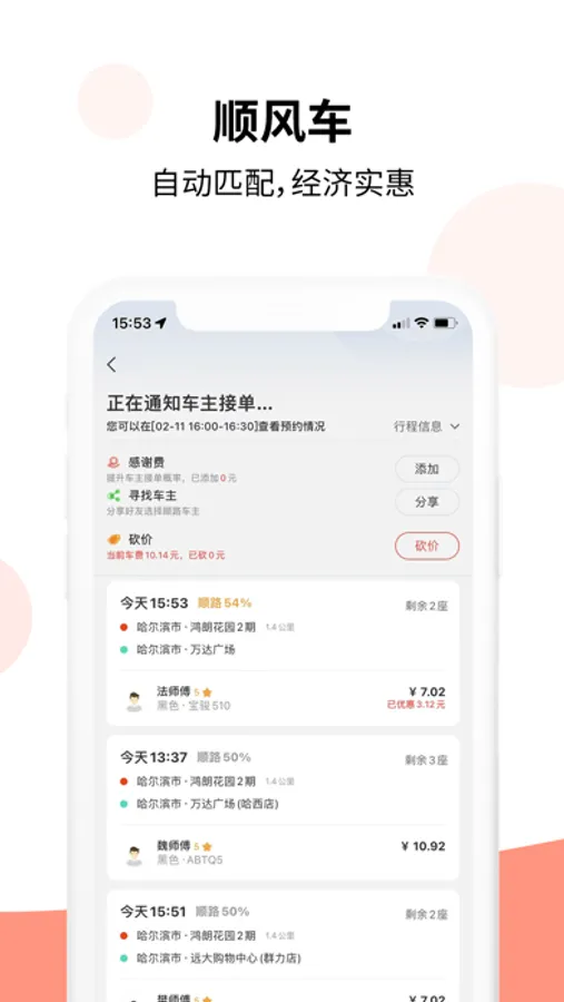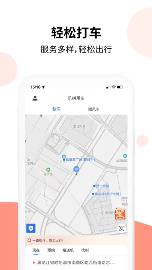 【拼车】:顺风车拼车出行,更省钱;