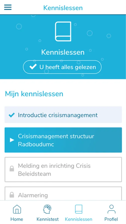 CrisisNet is een innovatie leerapplicatie voor organisaties die beschikken over een crisisorganisatie. De crisisapplicatie zorgt dat elke medewerker in zijn/haar rol bij een crisis of incident over alle noodzakelijke informatie beschikt. De leerapplicatie voorziet dat de medewerker de noodzakelijke kennis leert en op peil houdt middels kennislessen- en toetsen. Direct beschikking over up-to-date planvorming, procedures en instructies, belangrijke contactgegevens, dienstroosters en verslaglegging ten tijde van een crisis zorgt dat zij alle noodzakelijke informatie bij de hand hebben en kunnen volgen. De applicatie is ontwikkeld door het Radboudumc, meer informatie zie www.crisisnet.nl.
