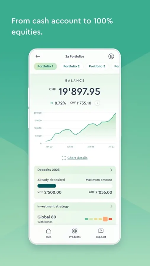 From interest-bearing accounts to 100% equities, broadly diversified with index funds and ETFs. You can adjust your investment strategy as needed or create your own individual strategy - at no extra cost.
