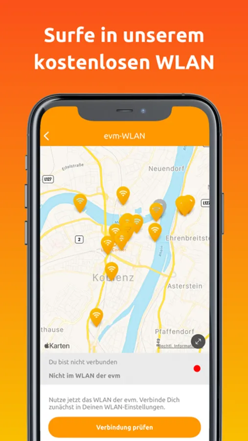Dein Datenvolumen leidet, wenn Du in Koblenz und Umgebung unterwegs bist? Mit der evm-App kannst Du zahlreiche WLAN-Punkte der evm nutzen. Der WLAN-Finder zeigt Dir die Hotspots in der gesamten Region. Mithilfe der App kannst Du dich einloggen und extra lange surfen.