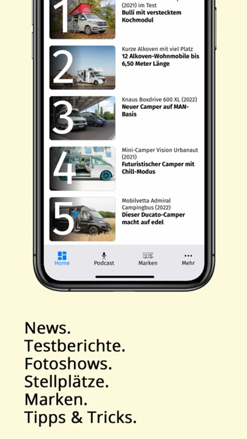 • Unter Fahrzeuge, Zubehör, Stellplätze und vielen weiteren spannenden Kategorien befinden sich News zu Neuheiten, Marken sowie spannende Tests.