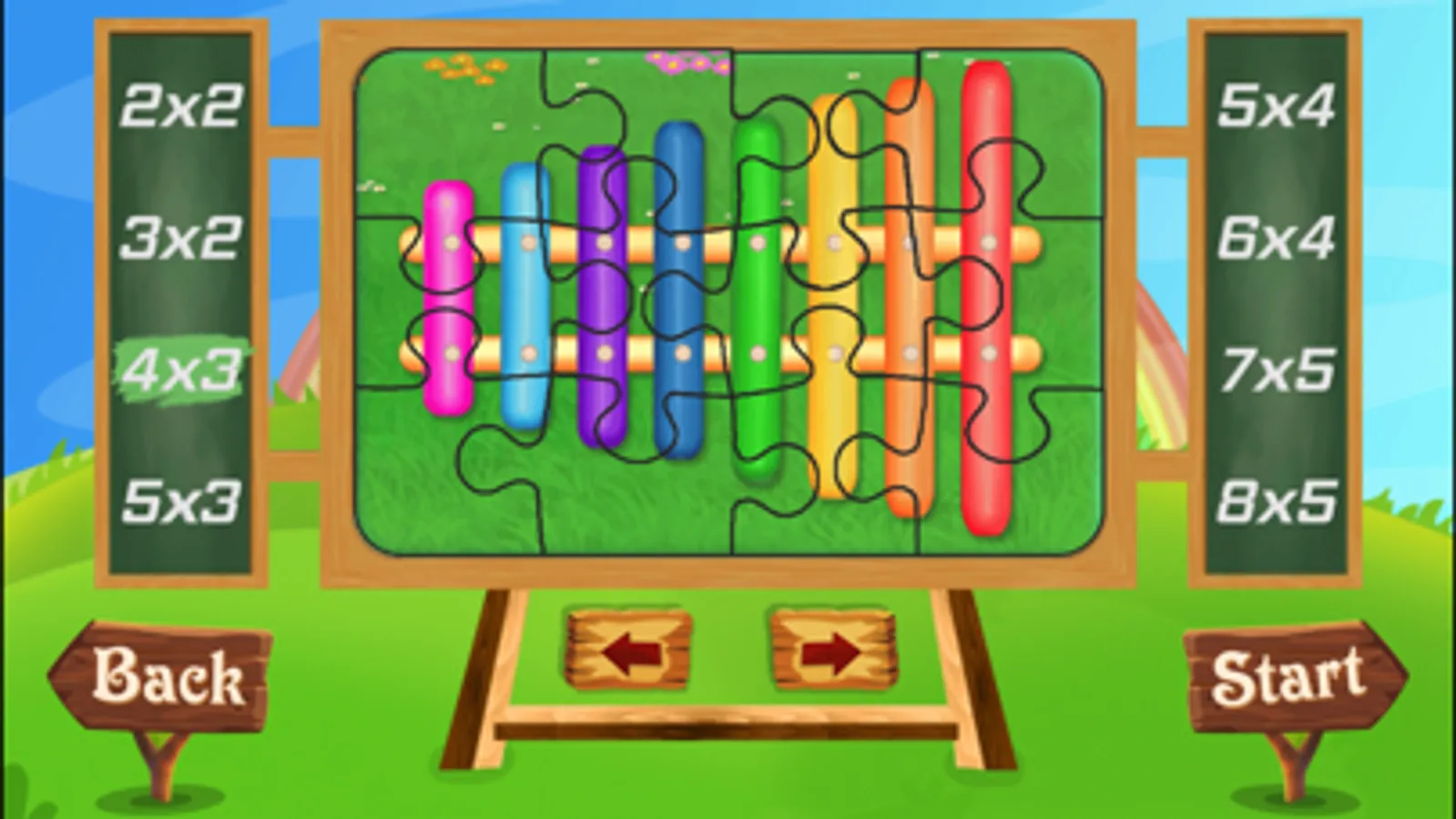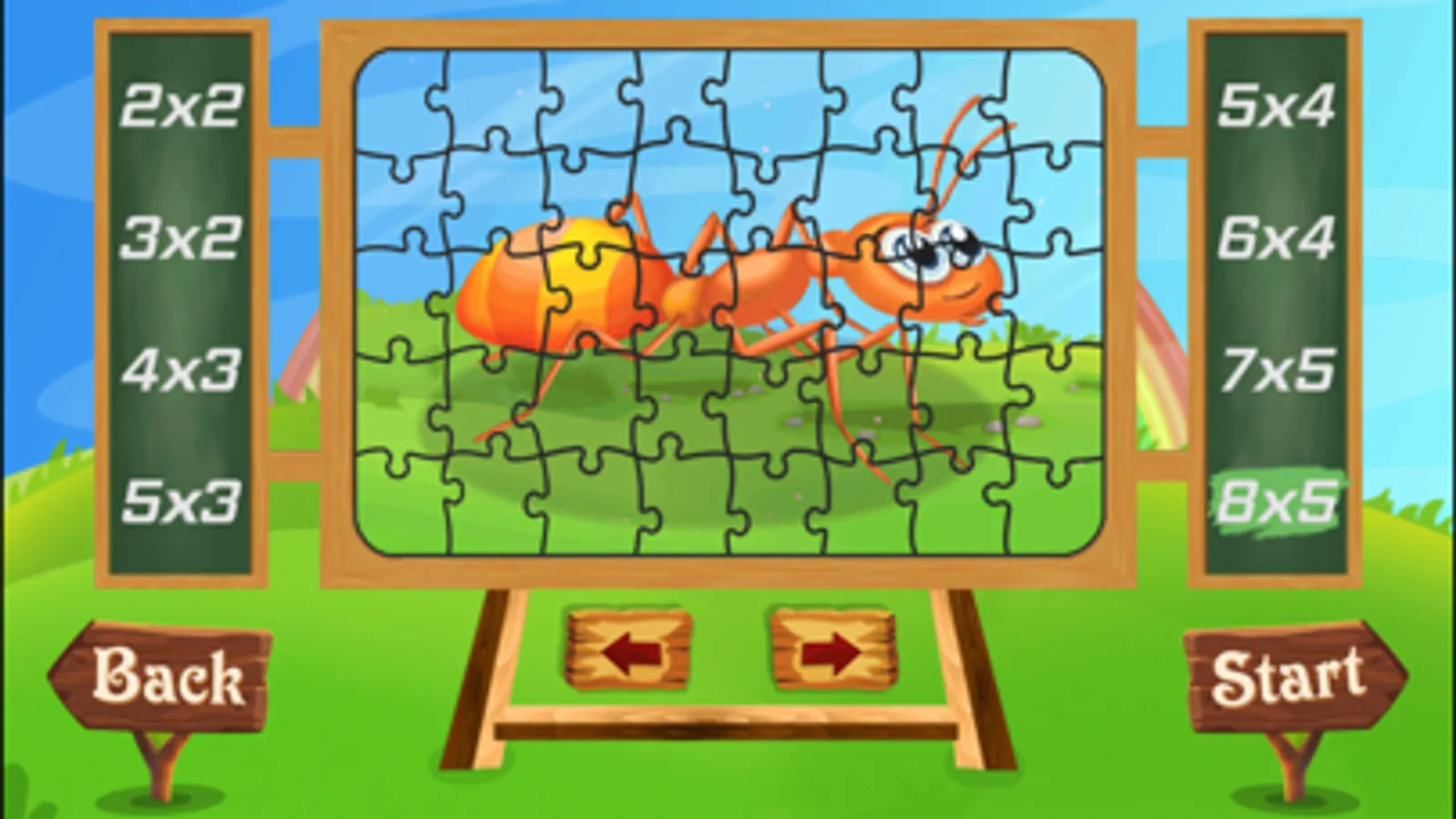 - 8 difficulty levels (2x2, 3x2, 4x3, 5x3, 5x4, 6x4, 7x5, 8x5)