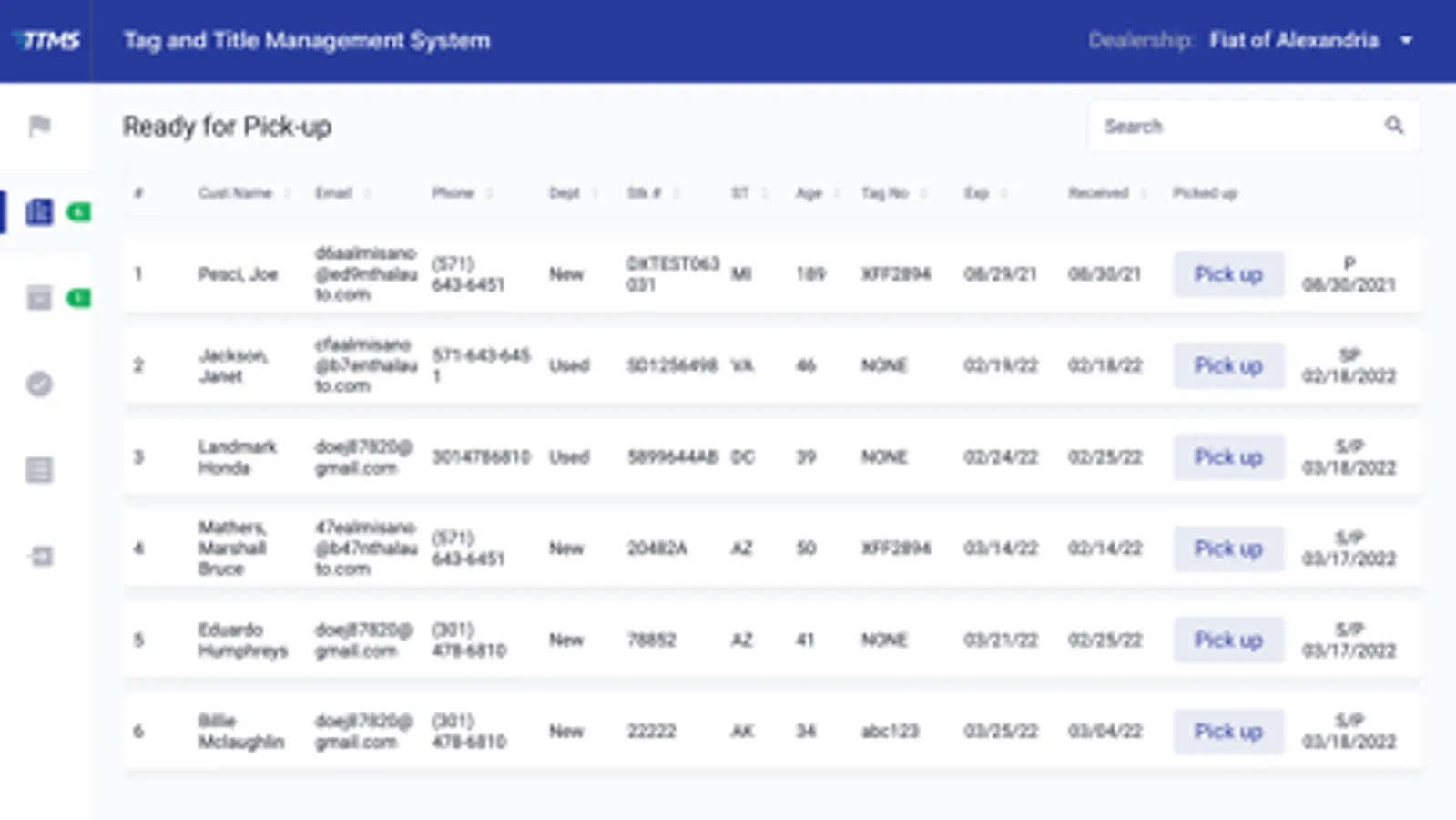TTMS is a tag and title tracking application for automotive dealerships. This application helps facilitate the process of when customer tags are ready to be logged and picked up. In addition, it allows for customer care representatives to notify the customer via email and/or SMS when the tags are ready. Ease of capturing customer's signature during the tag pick-up process. An optimal solution for allowing customer care representatives to log tag pick-up and shipment.