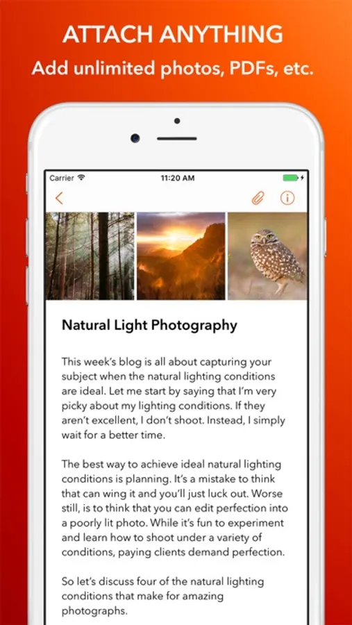 Add supplementary information to a note by attaching any number of photos, PDFs, and other files (free version is limited to one per note).