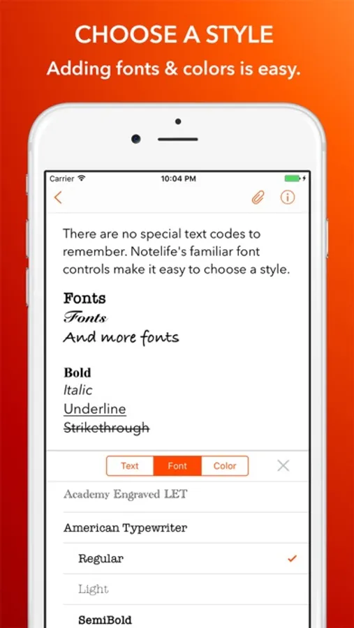 Choosing fonts and colors is effortless. Instead of having to remember obscure text formatting codes (like Markdown syntax), Notelife offers familiar font controls that make it easy to choose your style. Plus, you can insert tables and lists into your notes.