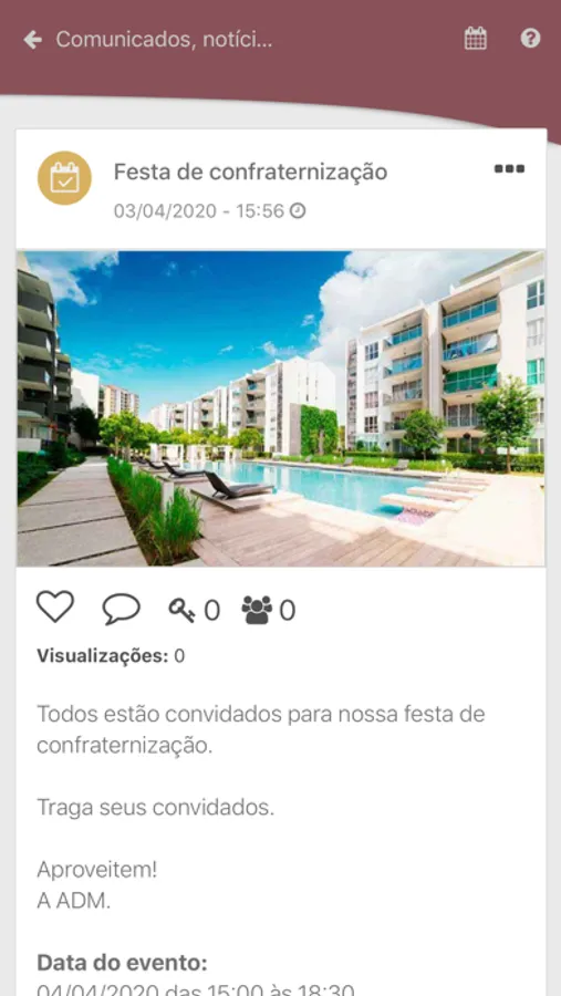 Chat: O CondominiumApp conta ainda com um Chat exclusivo e oficial do condomínio. Um canal de comunicação oficial e em tempo real entre a equipe do Condomínio e os moradores;