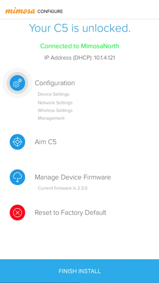 Mimosa Install App sets the new standard for ISPs to control installation processes for completely off-the-shelf client (PTMP) devices (Mimosa C5, C5c or C5x), and speed up installations at customer's homes using a Mimosa G2 Gateway. We have automated the device unlock and firmware upgrade process. This simplifies correlating the installed Mimosa client device with the unique subscriber and their service provisioning.