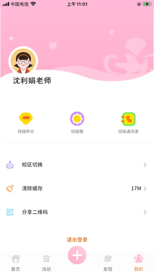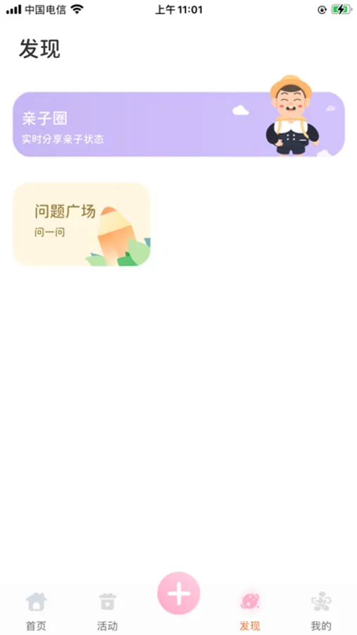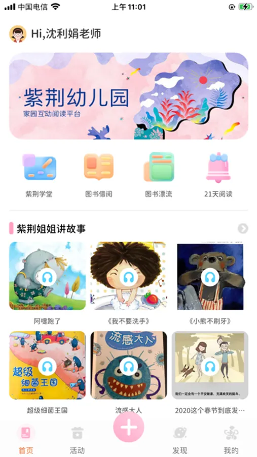 【发现】模块:含亲子圈和21天活动以及问卷调查,亲子圈以班级为单位来分享幼儿的点滴成长,21天活动可以培养幼儿的阅读习惯,让幼儿每天坚持阅读。问卷调查主要针对家长,让学校可以了解目前在教育方面的优缺点。