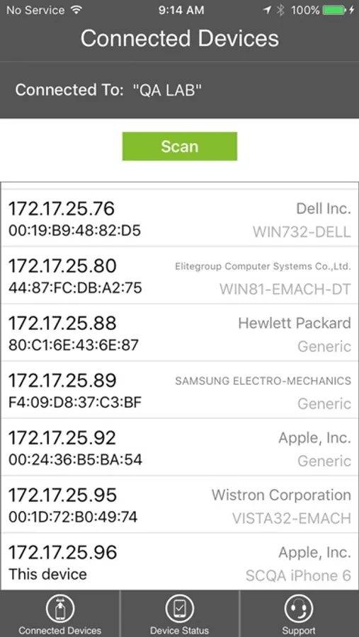 • Scan for all devices that are connected to your network, with information including IP address, manufacturer, and device name.