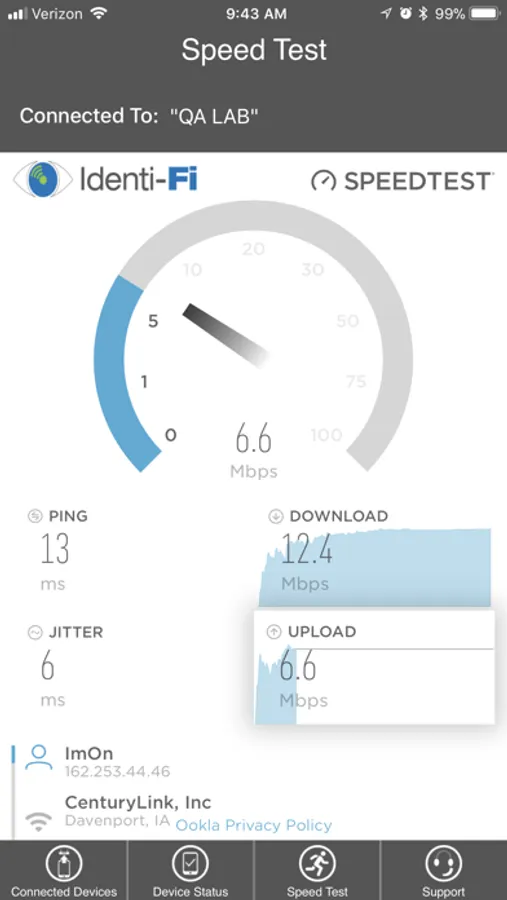 • Run a speed test that includes a ping, jitter, download speed and upload speed.