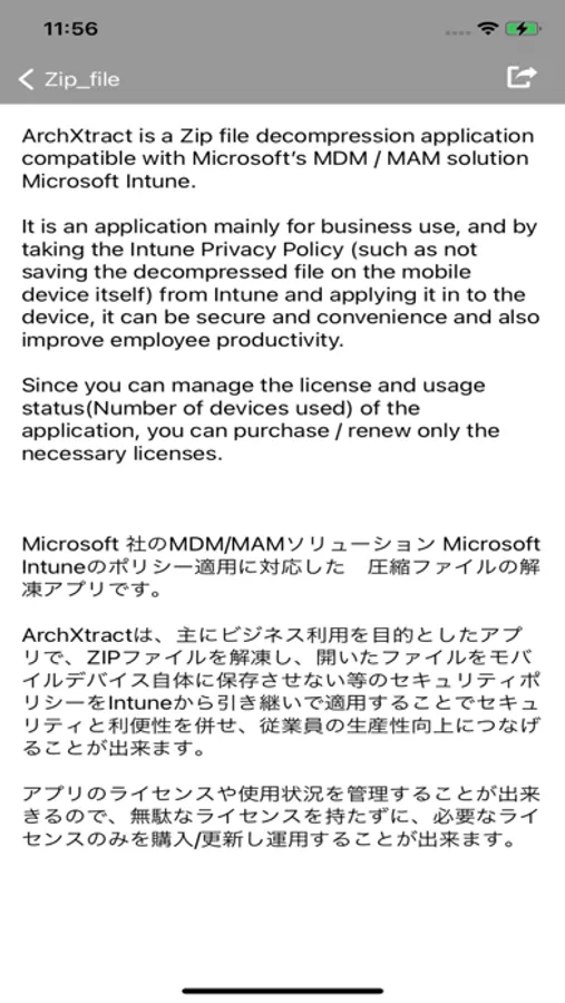 ZipExctractor is the only Zip extracting app controllable from Microsoft Intune.Open password protected Zip files directly and securely from MS Outlook Mail App on mobile devices. It allows Enterprise administrators to implement tight security policies on how the data in Zip files is viewed and shared with other apps on mobile devices.