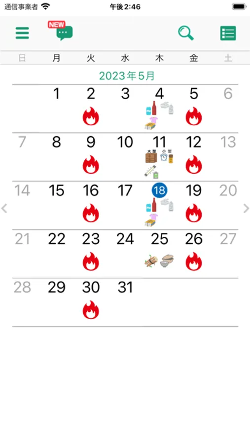 今日と明日、週ごと、月ごとの3パターンによるごみ収集日程を一つの画面ですぐに確認することができます。